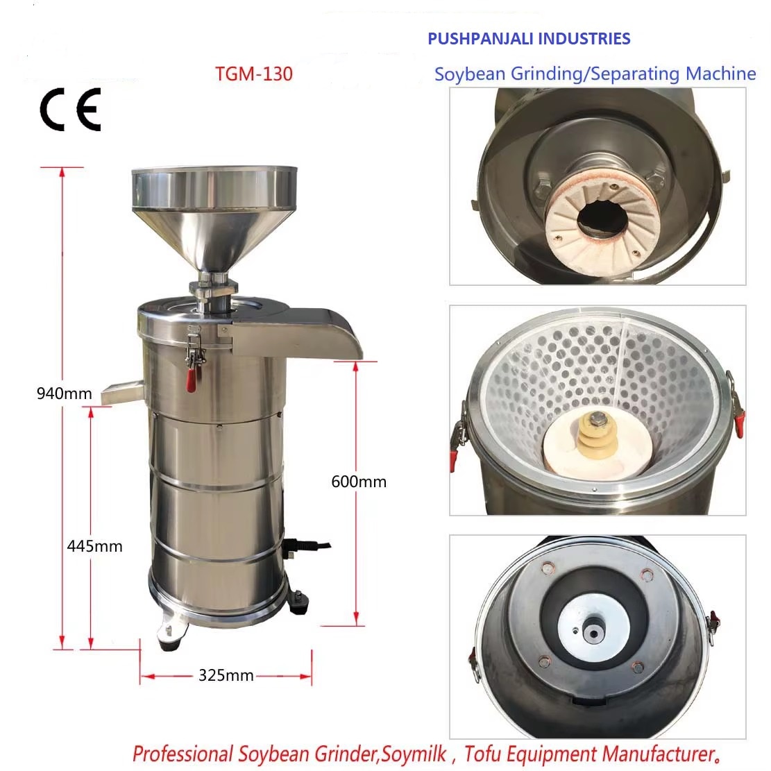 Application: Soybeans grinder machine. Suitable for make soy milk, Tofu etc. Application to the unit canteens, restaurants and small food processing plants. Features: The machine is made of SUS 304 stainless steel, which can help you grind soybeans and remove slag at one time, produce rich soymilk, and separate Okara like snowflakes. Brief Introduction. 1. The unique feed mechanism, special grinding device for the bore and motor, effectively solve the problem of water leakage of the equipment. 2. The well-designed grinding chamber can make the slurry flow smoothly, less material accumulation and easy cleaning. 3. Practical and unique adjustment mechanism of fine and fine pitch, convenient adjustment and reliable locking. 4. The specially formulated grindstone has long service life and high output. 5. Clean and sanitary, the whole working flow channel from feeding, grinding to discharging Application: It is suitable for soy beans and soy beans after soaking, soaking soft goods, grinding and other functions. Key Attributes Power Source Electric Voltage 220 V Material Stainless Steel Power(W) 1.5KW Installation Plug-And-Play Maintenance Easy Cleaning Feature Easy Cleaning Dimension(L*W*H) 40*40*102 Model Number TGM-130 Brand Name Pushpanjali Machinery Function Grind soybeans to produce soybean milk. Weight 45kg