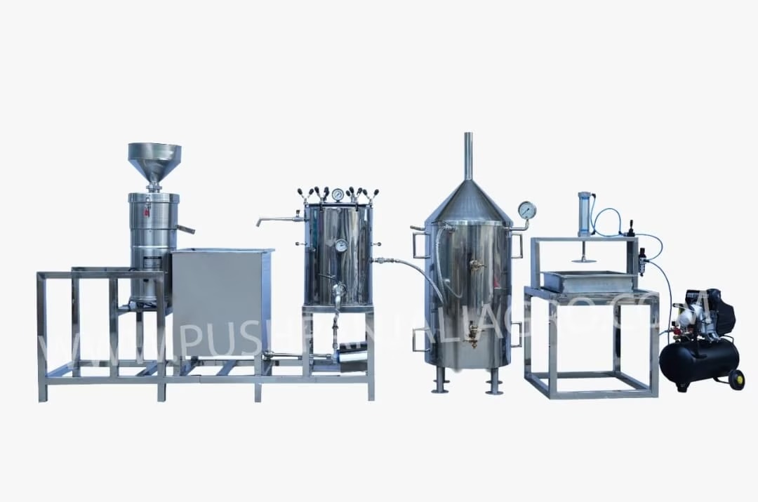 Soya Milk and Tofu (Soya Paneer) Making Plant, a multi-stage industrial food processing system designed to produce plant-based milk and solidified products like tofu. System Components Based on the visual layout, the plant typically includes these key units: Soya Bean Grinder and Milk Extractor: The leftmost unit with the hopper (funnel) is used for grinding soaked soybeans and separating the milk from the pulp (okara) [3, 4]. Soya Milk Sterilizer & Boiler: The central stainless steel tanks are used for boiling and sterilizing the extracted milk to ensure safety and improve digestibility [4, 23]. Steam Generator/Boiler: A vertical unit (often seen in the middle) that provides high-pressure steam for the heating and sterilization processes [14, 25]. Pneumatic Tofu (Paneer) Press: The small unit on the far right uses air pressure to press curdled milk into solid blocks of tofu, giving it a uniform shape [15, 16]. Specifications & Pricing Typical commercial setups for this type of machinery include: Production Capacity: Common models range from 100 LPH (Liters Per Hour) up to 500 LPH [3, 9, 10]. Material: Constructed from food-grade stainless steel (often SS 304) for hygiene and durability [3, 10, 16]. Power: Generally requires around 1 HP to 3 kW depending on the automation level [3, 10, 19].